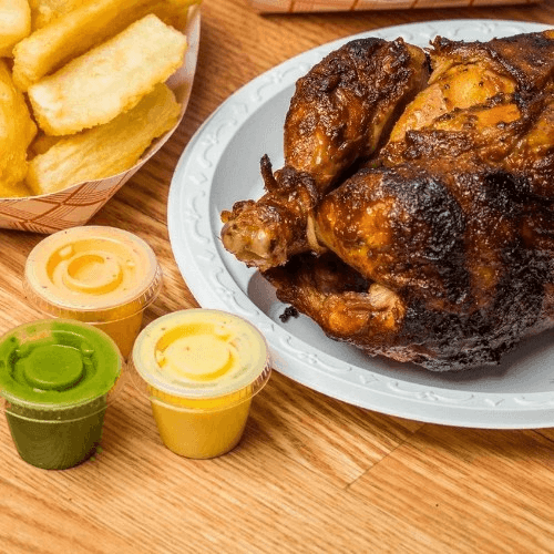 1 whole chicken, extra large fries and extra large yuca. (4 sauces included). No substitution