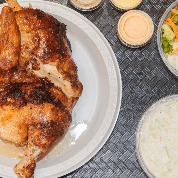 One whole chicken, 3 large side orders and 4 can sodas (4 sauces included)